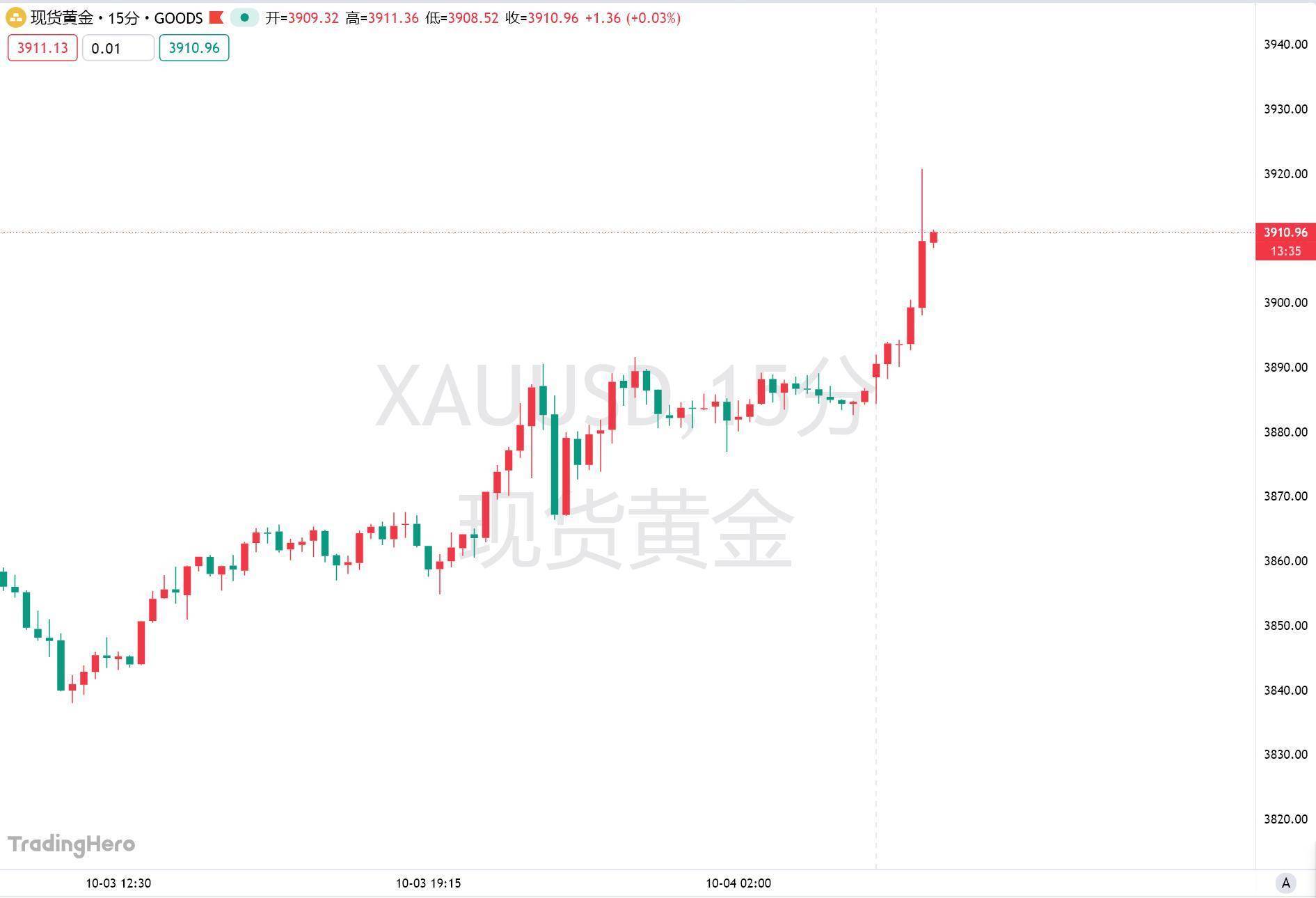 周一,由于美国政府持续关门带来的不确定性加剧以及降息预期升温,现货黄金开局维持强势,一度向上触及3920美元/盎司,再创历史新高。此时距离首次突破3800美元关口仅不到10天。