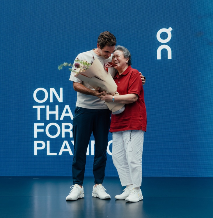 图为费德勒为刘运智送上鲜花和祝福,致敬中国网球事业幕后英雄。