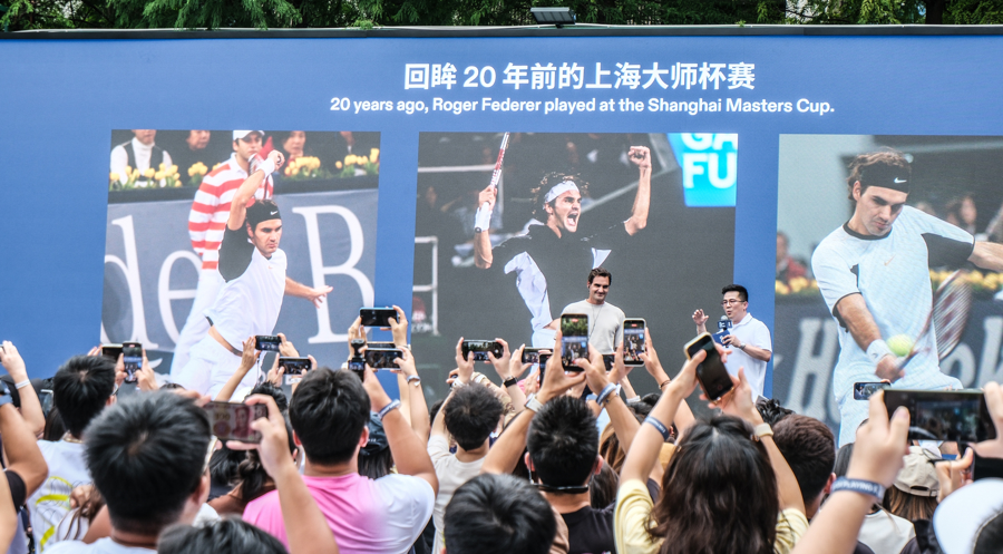 图为现场用视频和图片回顾费德勒20年前参加上海大师赛时的精彩时刻。